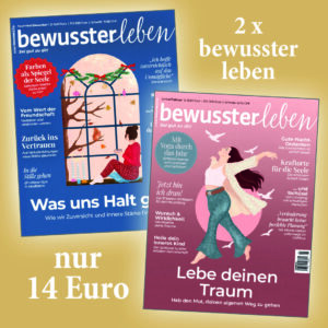 2 Ausgaben bewusster leben in Folge zum Preis von Euro 14,00 (Inland), Euro 17,00 (Ausland), CHF 25,00 (Schweiz). Wenn Sie nach Erhalt der zweiten Ausgabe nicht kündigen, verlängert sich Ihr Abo um jeweils ein Jahr (Inland Euro 48,00, Ausland Euro 54,00, Schweiz CHF 84,00). Sie haben jederzeit die Möglichkeit, das Abo zu kündigen. Das Mini-Abo beinhaltet kein Dankeschönprämie.
