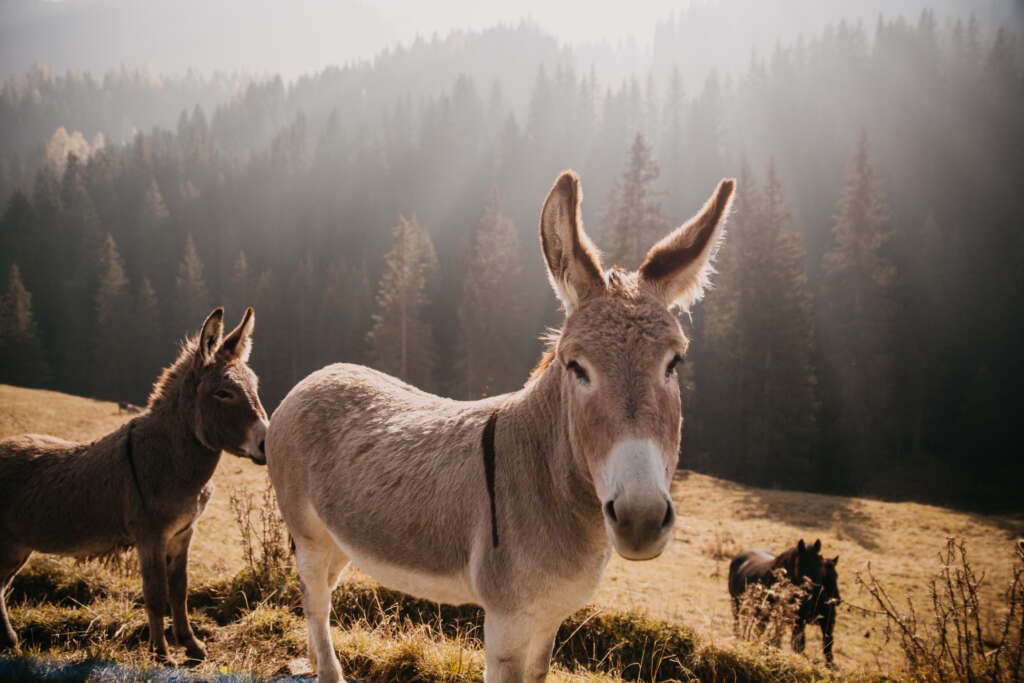 Am nächsten Morgen startet auf dem Hof in Halltal unsere 7-tägige Wanderung: Fünf Esel, fünf Menschen und die Steiermark. Die erste Etappe führt uns nach Mooshuben. Für unsere Reiseleiterin Judita sind die Esel so etwas wie Familienmitglieder. Sie kennt die Tiere seit Jahren, trainiert regelmäßig mit ihnen und weiß viel über die Psyche jedes einzelnen Esels und die Beziehungen der Esel untereinander.