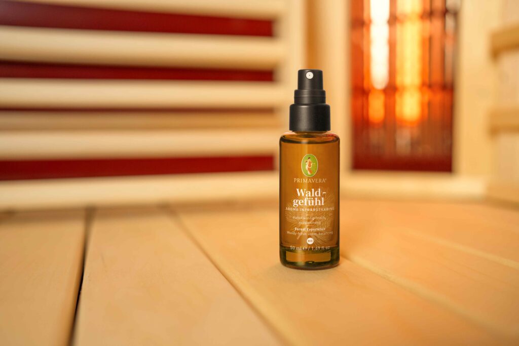 Zu den beschriebenen Möglichkeiten der „kleinen Auszeit“ können auch regelmäßige Schwitzanwendungen avancieren, ob in der Sauna oder Infrarot-Kabine. Beides sind der ideale Rahmen für Momente des Innehaltens. Das neue Infrarot Kabinen-Spray Waldgefühl – mit Zirbelkiefer bio, Riesentanne bio und Grapefruit bio – lässt uns den Duft von frischem Tannengrün und sonnenverwöhntem Holz schnuppern, wohlige Wärme durchflutet uns – und verheißt pure Energie für Körper, Geist und Seele.